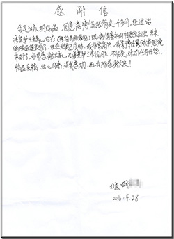 一个多月前,胡女士查出溃疡性结肠炎,本以为靠着药物缓解不适症状即可好转。不想后来病情加重,腹部总是剧烈疼痛,甚至经常出现脓血便的情况。疼痛难耐的她,于4月9号来重庆嘉华胃肠病医院就医,经过嘉华何晓东主任半个月的精心治疗(保留药物灌肠),原来的脓血便已经没有了,大便已经成型,现在于4月23号康复出院,患者亲自送来感谢信以示谢意。