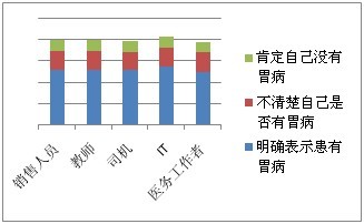 在胃肠健康状况大调查中,参与调查的人群主要为中青年,其职业主要包括:销售人员、教师、司机、IT、医务工作者等。调查的数据得知,65.55%的网友明确表示患有胃病,22.18%的人不清楚自己是否有胃病,只有12.27%的人肯定自己没有胃病。》》》您有胃部不适吗?问问医生